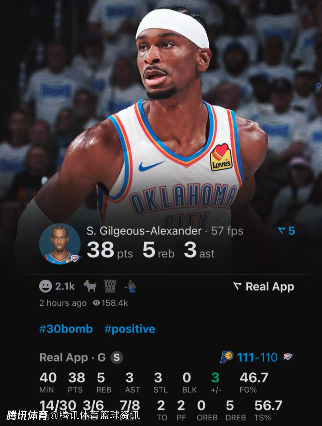 2025-06-06 11:50北京时间6月6日,NBA季后赛继续进行,雷霆在总决赛首场比赛中以110-111不敌步行者。本场比赛中,雷霆球星亚历山大出战39分钟,全场30投14中,其中三分球6投3中,罚球8投7中,空砍38分5篮板3助攻3抢断。