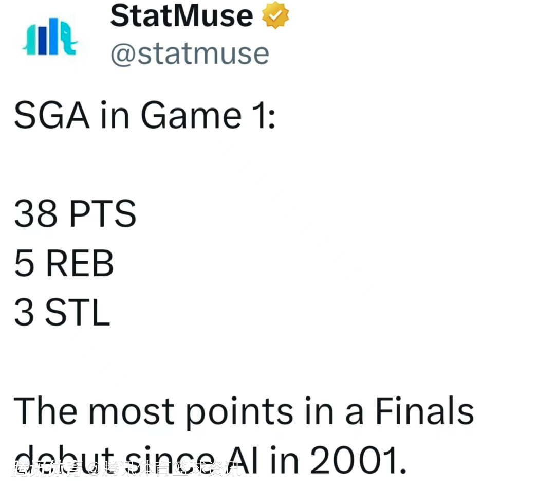 根据数据统计显示,凭借本场表现,亚历山大成为自2001年艾弗森以后,在总决赛首秀中得分最高的球员,同时,他也打出了NBA历史上总决赛首秀得分第三高的表现。