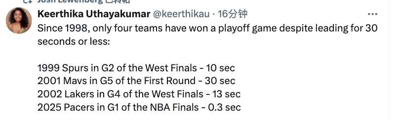 2025-06-06 11:50北京时间6月6日,NBA总决赛G1,步行者在一度落后雷霆15分的情况下,靠着哈利伯顿最后的准绝杀,以111-110险胜,总比分1-0领先。