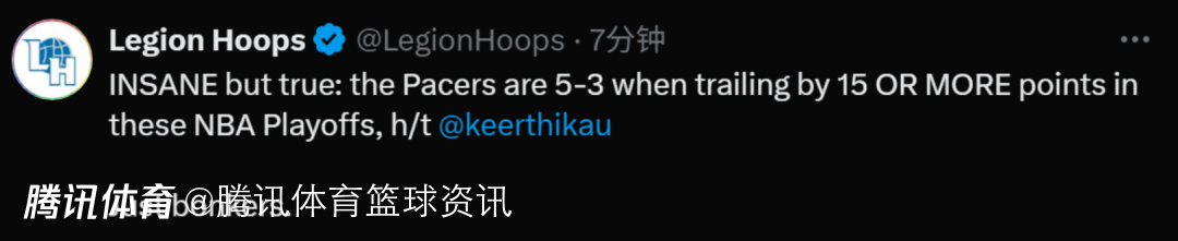 另外,在今年季后赛,步行者在落后15分或者更多分时,战绩来到了5胜3负。