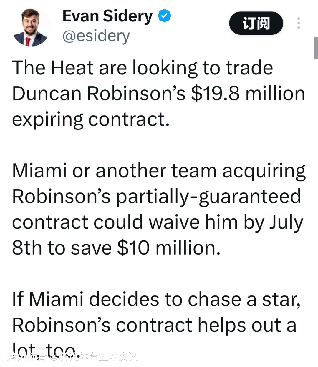 据悉,热火或其他收购罗宾逊部分保障合同的球队,可在7月8日前裁掉他以节省1000万美元。如果热火决定追逐其他球星,罗宾逊的合同也能提供极大帮助。此前,在热火队记Barry Jackson的报道中就曾提到,热火希望通过球员交易来匹配薪资,而不是损失未来选秀权作为筹码,关于引进杜兰特的方案中就涉及到邓肯-罗宾逊的到期合同。