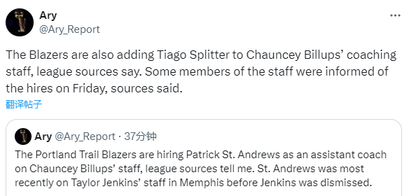 与此同时,消息人士还表示,开拓者队同时也将蒂亚戈-斯普利特纳入比卢普斯的教练团队。部分教练组成员已于周五被告知这两项聘用决定。