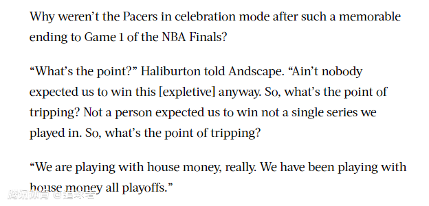 谈到总决赛G1绝杀取胜后为何球队没有在更衣室疯狂庆祝?哈利伯顿接受采访时表示:庆祝有什么意义?反正压根没人指望我们能赢下这该死的比赛。所以激动个啥?从始至终都没人觉得我们能赢下任何一轮系列赛,那现在我们又有什么好激动的?