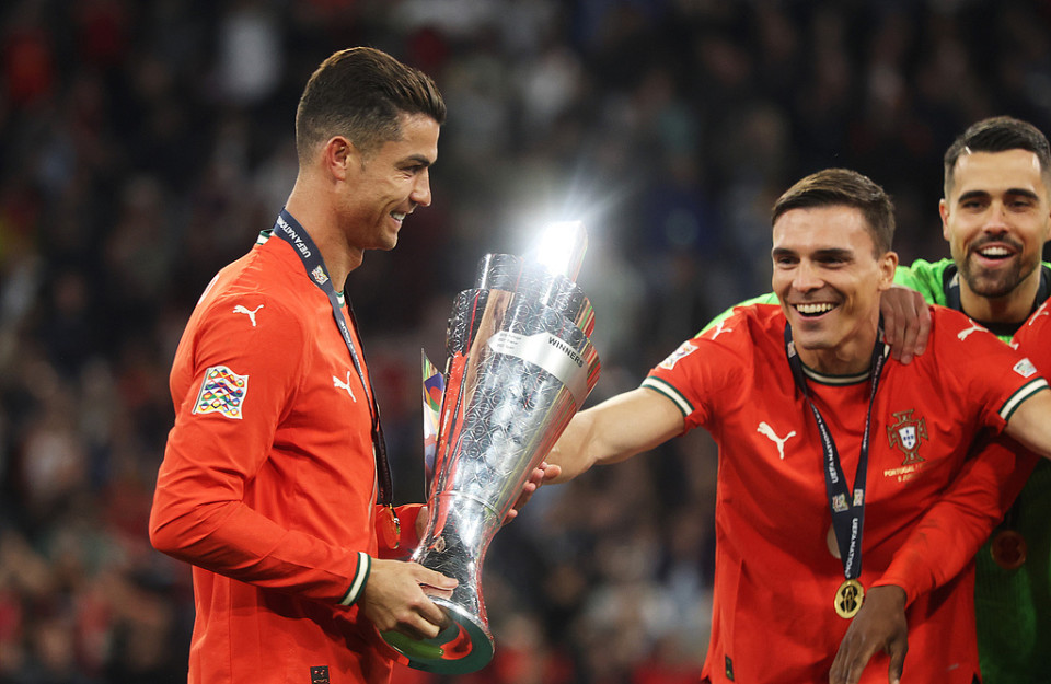 最终,C罗在队友的簇拥下高举起欧国联冠军奖杯。这一刻,他和葡萄牙重返欧洲之巅。