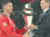 而赛后的颁奖仪式上,40岁的葡萄牙队长C罗毫无疑问是绝对的主角。作为队长的他,压轴出场。