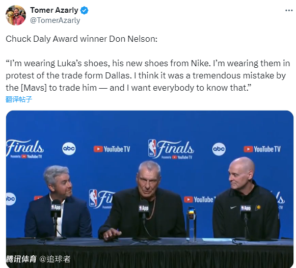 2025-06-09 08:20北京时间6月9日,前NBA名帅唐-尼尔森正式获得查克-戴利终身成就奖,85岁传奇名帅穿着东契奇签名鞋亮相,以此抗议独行侠交易东契奇,更是直言:这是一个巨大的错误。