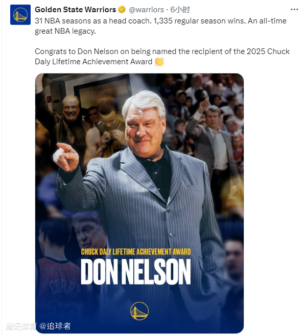 勇士官方晒海报祝贺老尼尔森获得终身成就奖。