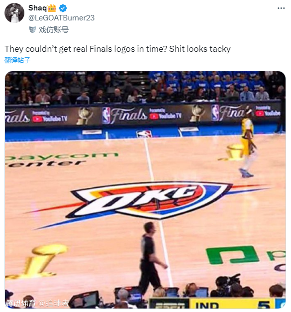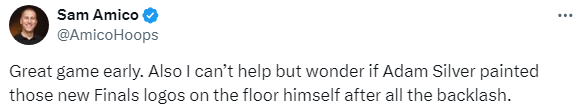 名记Sam Amico发推写道:比赛一开始就很精彩。而且,我不禁好奇,在经历了这么多的反对之后,那些新的总决赛标志是不是亚当-萧华自己画在地板上的?