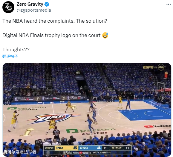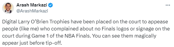 NBA记者Arash Markazi则吐槽:为了安抚像我一样抱怨NBA总决赛地板上没有总冠军标志的人们,我们特意在球场上放置了数字版拉里-奥布莱恩奖杯,你可以在开球前看到它们神奇地出现。