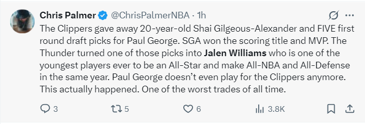 第二节杰威爆发了,他单节6中3+罚球3中3拿到9分2篮板2助攻,他是雷霆一度领先到23分的功臣,如此一来雷霆记者的风向又变了:快船用亚历山大+5个首轮签换来乔治,SGA拿到得分王+MVP,其中一个首轮签选中杰威,本赛季杰威入选全明星、最佳阵容、最佳防守阵容。快船进行了历史最差交易。