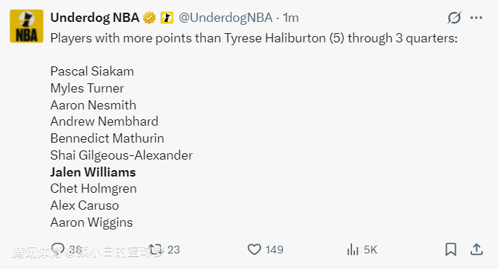 第三节杰威三分2中1+罚球4中3拿到6分,三节27分钟,11中4+罚球3中1拿到15分5篮板4助攻,美媒:三节打完得分比哈利伯顿多的球员有10人,杰威就是其中之一。