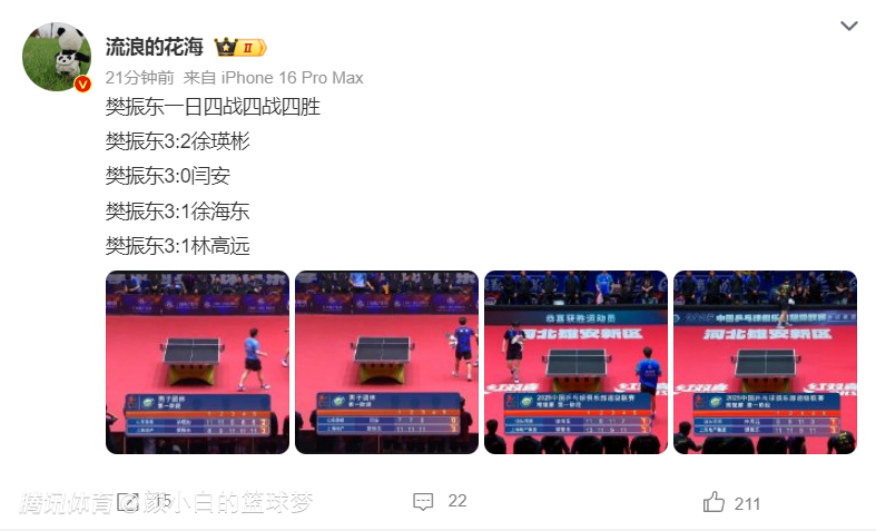 樊振东这一天实在是太过于强悍了,一日四战全胜!3-2徐瑛彬、3-0闫安、3-1徐海东、3-1林高远,这就是王者霸气吧。