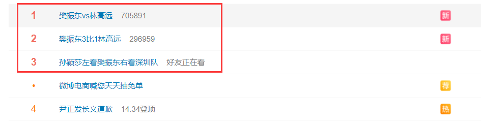 这场比赛后樊振东等于是包揽了热搜前三,樊振东3-1林高远、樊振东VS林高远、孙颖莎左看樊振东右看深圳队。