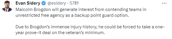 该记者写道:“布罗格登作为替补控卫人选,将在完全自由球员市场中引发争冠球队的兴趣。鉴于布罗格登频发的伤病史,他可能不得不接受一份老将底薪的合同,花费一年的时间来证明自己。”