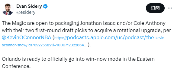 2025-06-11 06:20北京时间6月11日,根据雅虎体育记者Kevin O‘Connor的报道,魔术队今夏休赛期愿意打包交易乔纳森-艾萨克和/或科尔-安东尼,以及他们手中的两个首轮选秀权,以寻求提升轮换阵容的交易机会。