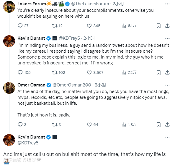 杜兰特:我正刷着推特,一个家伙突然发推对我的职业生涯指指点点,我回复说我不认同,结果反倒成了玻璃心,谁来给我解释下这个逻辑?按我说,无缘无故来找事的人就是缺乏安全感,如果我错了,请指正。