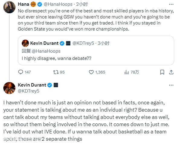 杜兰特:我没做什么”只是你的个人观点,并非基于事实”。再说一次,你的说法是在说我个人,对吧?因为谈论我的球队就不可能不牵扯其他人,也就是说,不让他们参与到谈话中。最终还是只说我自己。我已经列举了我做过的事情。如果你想谈论团队篮球,那是另一码事。