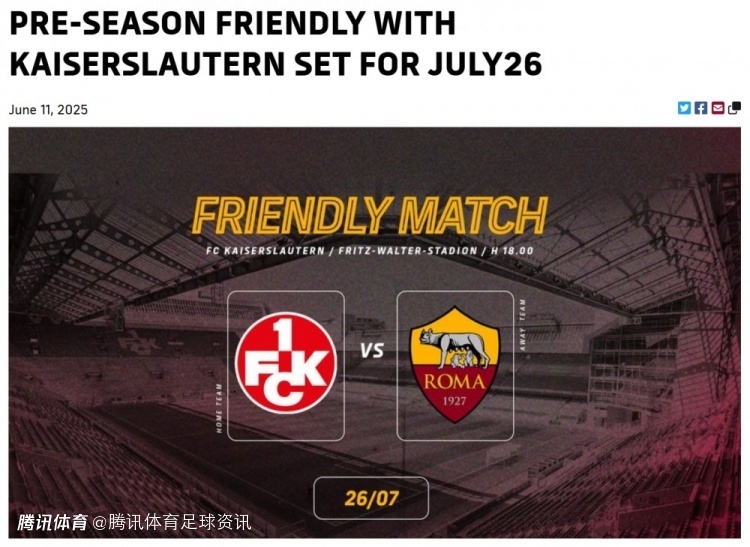 2025-06-11 19:10北京时间6月11日,罗马俱乐部今日通过官方渠道宣布,球队将在当地时间7月26日(周六)与德乙劲旅凯泽斯劳滕进行一场夏季友谊赛。