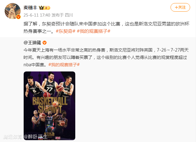 另一位媒体人麦穗丰报道表示:“据了解,东契奇预计会随队来中国参加这场比赛,这也是斯洛文尼亚男篮的欧洲杯热身赛事之一。”
