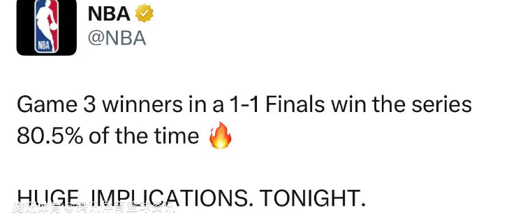 2025-06-12 07:50北京时间6月12日,NBA季后赛继续进行,步行者将坐镇主场甘贝里奇球馆与雷霆展开总决赛第3场比赛。赛前,NBA官方账号发推强调本场比赛重要性。根据数据统计显示,在前两场比赛大比分1-1的总决赛中,赢下第3场的球队有80.5%最终赢下系列赛,获得总冠军。