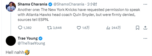 自从解雇锡伯杜以来,尼克斯四次申请面试对方球队的主帅均被拒绝,名记shams报道老鹰拒绝尼克斯请求后,老鹰当家球星、被称为“纽约市长”的特雷-杨第一时间发推写道:想都别想(笑哭表情)。