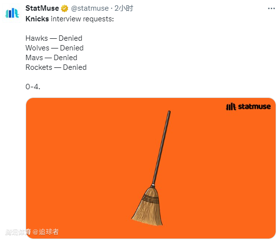 美媒StatMuse晒图调侃尼克斯被横扫:尼克斯请求面试,遭老鹰、森林狼、独行侠和火箭拒绝,0-4被横扫;NBA名宿加内特发推,配上穆大叔摇手指的经典动作并且写道:每次尼克斯队请求采访许可都被拒绝,太疯狂了。