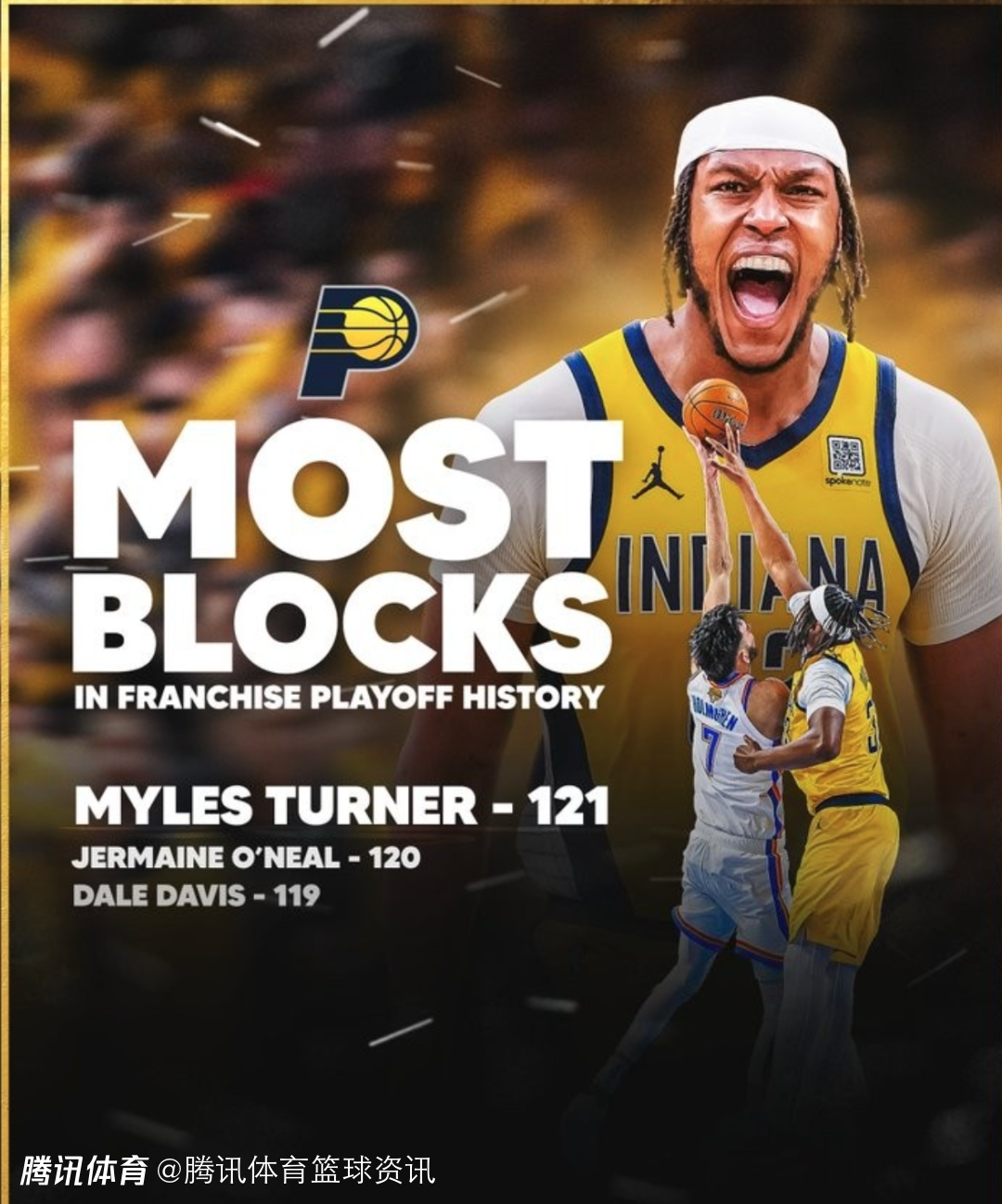 比赛第二节,特纳拿到了本场比赛的第二次盖帽,凭借这一盖帽,他的季后赛生涯盖帽数来到了121次,超越小奥尼尔,成为步行者队史季后赛的盖帽王。