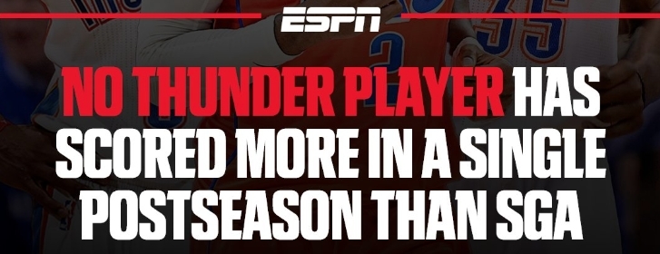 此役之前,亚历山大在今年的季后赛中已经得到了548分,距离杜兰特的纪录仅有22分的差距。本场比赛进行到第四节结束前3分23秒,亚历山大后撤步中投得手,拿到个人本场第24分,完成了对于杜兰特的超越。而在雷霆队史上,单次季后赛得分第3高的球员是威斯布鲁克,他在2014年的季后赛中曾拿到了507分。