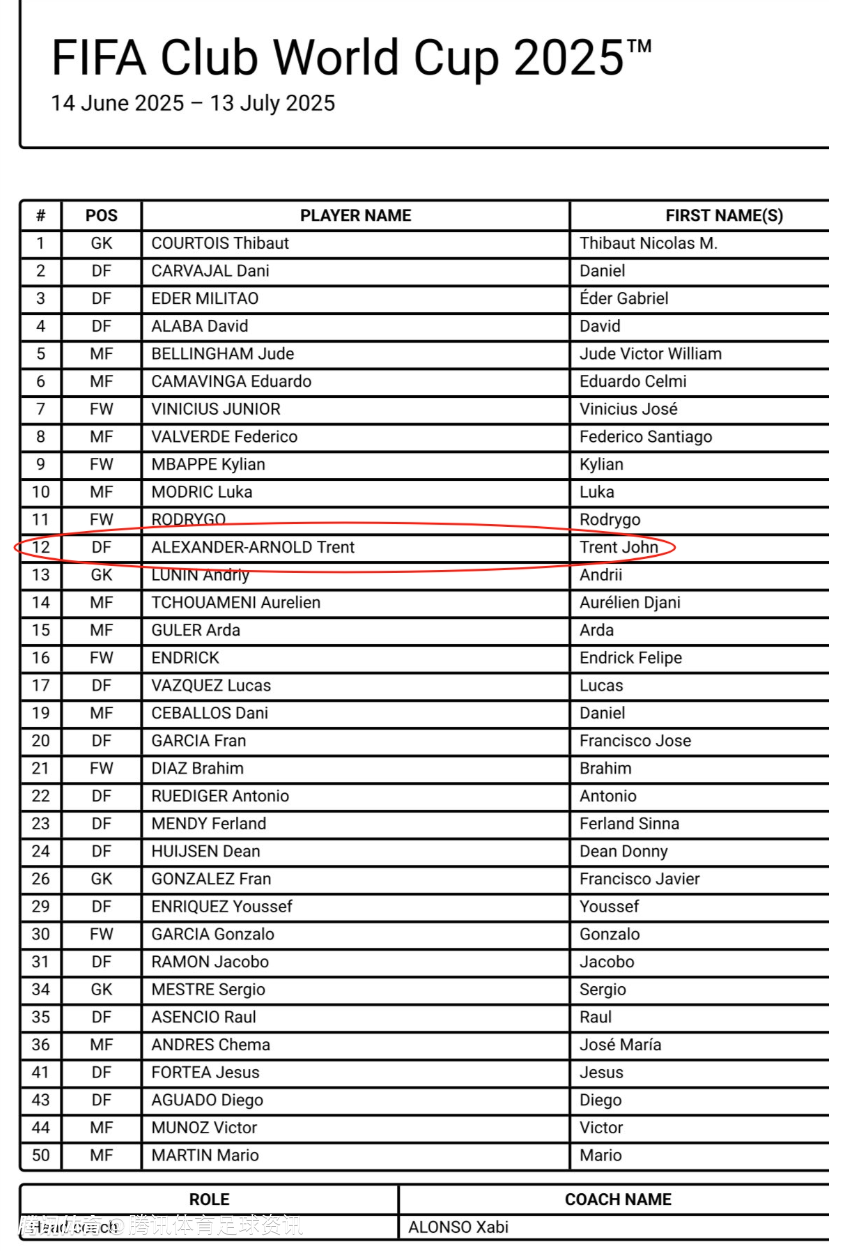 不是66号!官方:阿诺德将在世俱杯期间身披皇马12号 球衣背后印“特伦特”