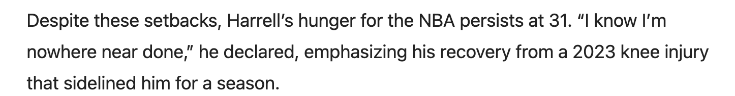 尽管历经挫折,哈雷尔对NBA的渴望从未熄灭,他强调自己已经从2023年导致赛季报销的膝伤中完全康复,并且表示“我知道自己远未终结。” 访谈中他也直面外界偏见:“他们因为我的脏辫、纹身和穿刺而畏惧我。” 但哈雷尔始终强调自己的职业态度以及与球队工作人员的深厚情谊。