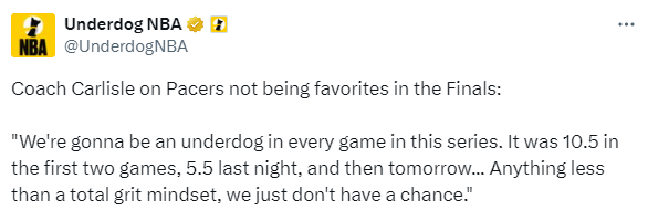关于步行者在总决赛中不被看好的问题,卡莱尔表示:“我们在系列赛每场比赛都会是不被看好的一方。前两场预测差距是10.5分,昨天是5.5分,如果没有坚韧的心态,我们根本没机会。”