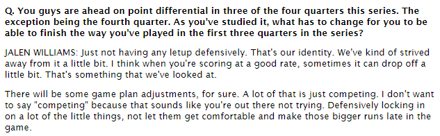 杰威:防守是雷霆立身之本 但球队最近在第四节表现有点偏离这个方向
