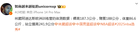 林葳想要在NBA拿到一份正规合同有多难?此前参加欧洲训练营的体测数据正式对外公布,裸高187.3公分,臂展188公分,体重86.6公斤,站立摸高241.9公分。