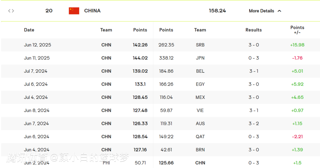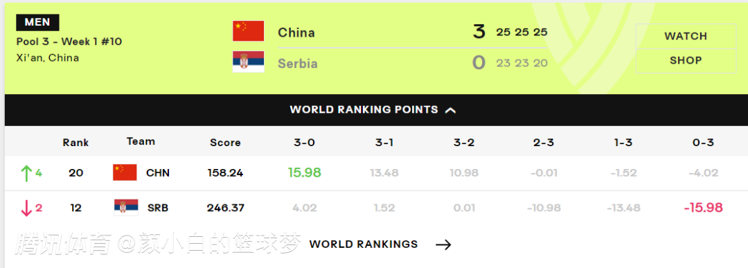这场比赛中国男排喜提15.98分,塞尔维亚男排则-15.98分,中国男排从世界第24位升至世界第20,而塞尔维亚男排从世界第十下滑到世界排名第12。