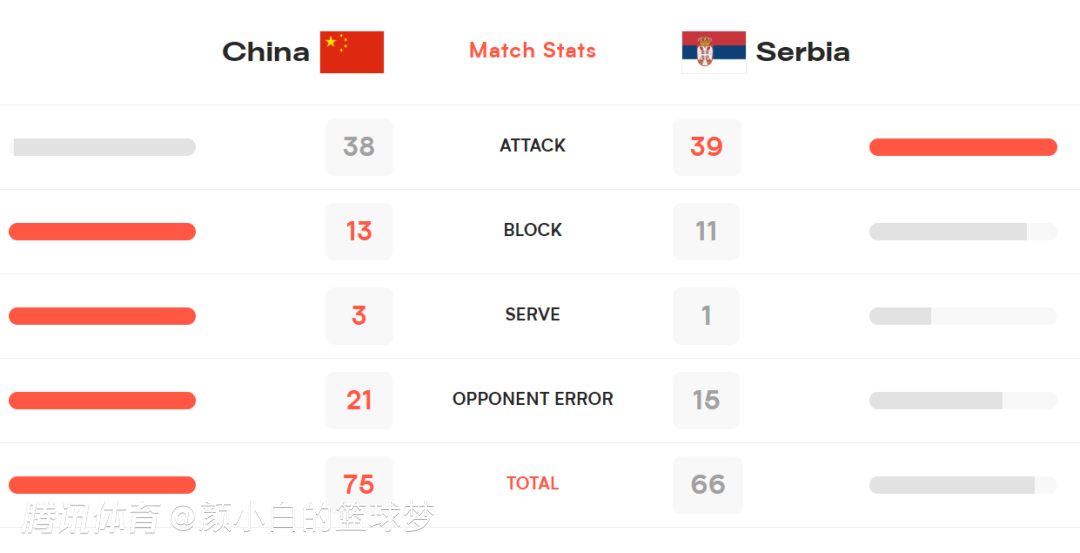 从两队的数据统计来看,进攻38-39中国队还输1分,但拦网13-11中国队赢2分,发球3-1赢2分,发球失误11-13赢2分,自失15-21赢6分,最关键的地方就是控制失误的能力。
