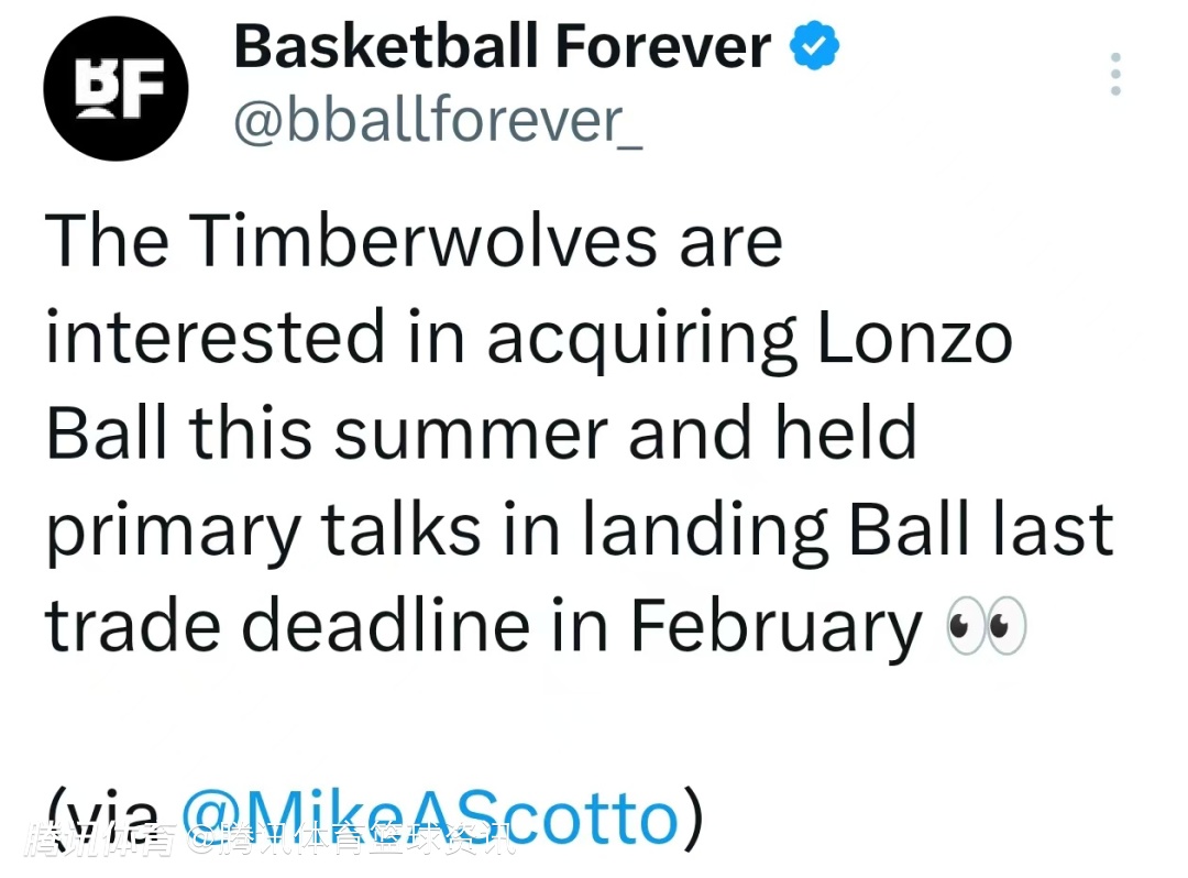 2025-06-13 08:40北京时间6月13日,根据记者Mike Scotto的报道,森林狼有意在今年夏天引进朗佐-鲍尔,且早在今年2月交易截止日就已就签下鲍尔展开初步谈判。