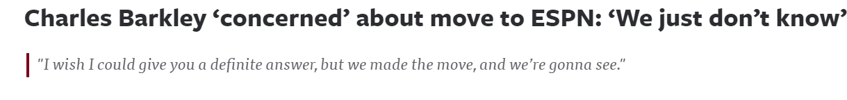 巴克利说道:“我们都很担忧,我不会撒谎,因为我们只是不知道(未来会怎样)。所以,我希望我能给你们一个明确的答案,但我们已经做出了这个变动,我们将会拭目以待。就像我说的,为ESPN工作会很酷。ESPN是世界上最著名的体育电视网,能在那里工作将是一种荣誉。”