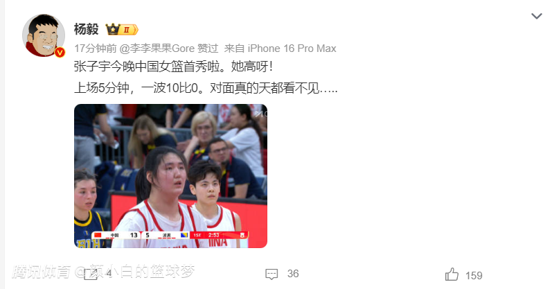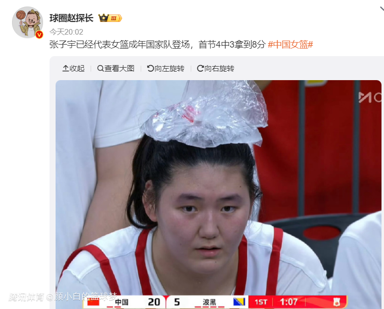 杨毅:张子宇今晚中国女篮首秀了,她高啊,上场5分钟一波10-0,对面真的天都看不见!