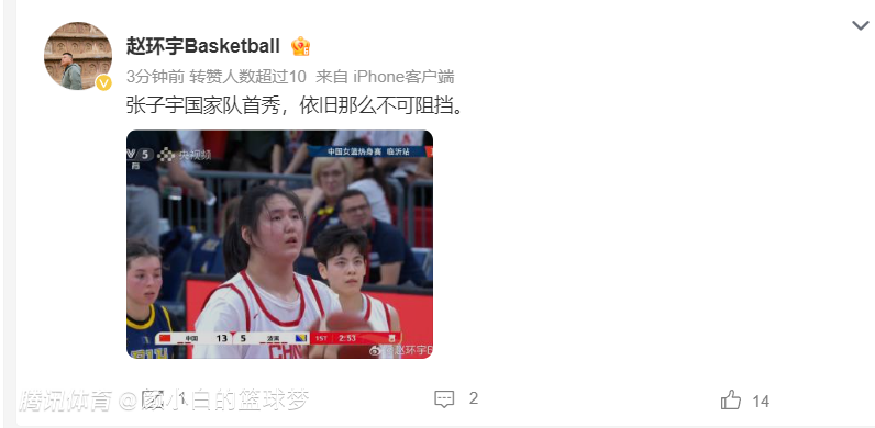 全场比赛张子宇12分47秒拿到18分7篮板,名嘴赵环宇:张子宇国家队首秀,依旧那么不可阻挡。