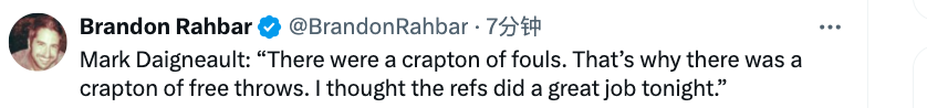 “这场比赛的犯规数量实在太多了,所以罚球也多得离谱。但我觉得裁判今晚的执裁表现非常出色。”此役雷霆全队罚球38中34,命中率为89.5%,步行者全队罚球33中25,命中率为75.8%。