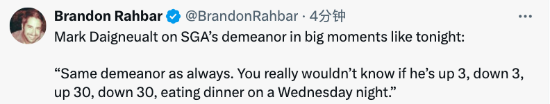 谈及亚历山大,戴格诺特说道:“他的表现显然非比寻常,堪称卓越。他的状态一如既往。不管是领先3分落后3分,还是领先30分落后30分,甚至是在周三晚上吃晚餐时,你都看不出他有什么不同。”此役亚历山大首发出战40分钟,24中12拿到35分,其中末节独揽15分。