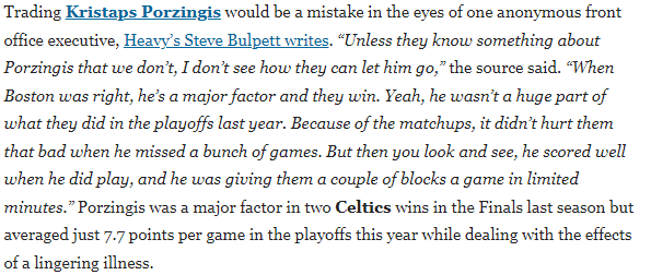 Steve Bulpett表示:“该消息源称,除非凯尔特人知道一些我们不了解的关于波尔津吉斯的内情,否则我无法理解他们为何要放走他。当波士顿体系运转正常时,他是关键因素,球队也能赢球。没错,他上赛季季后赛参与度不高,因为对位原因,他缺席多场比赛对球队影响不大。但细看会发现,他出战时得分效率不错,且在有限时间内场均能贡献几次封盖。”