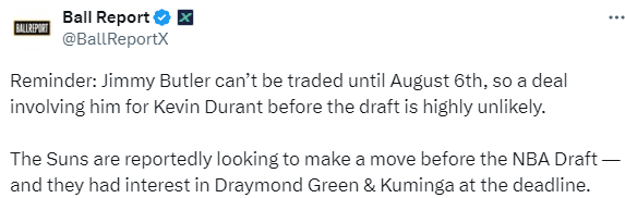 2025-06-15 10:40北京时间6月15日,美媒Ball Report发文表示,勇士球星巴特勒直到8月6日(当地时间)才能被交易,因此在选秀前用他换取杜兰特的交易可能性极低。
