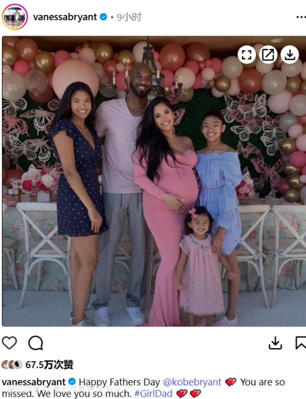去年父亲节,瓦妮莎同样在社媒晒出了全家福,而在科比去世之后,基本上每年父亲节,瓦妮莎都会在社媒祝科比节日快乐。