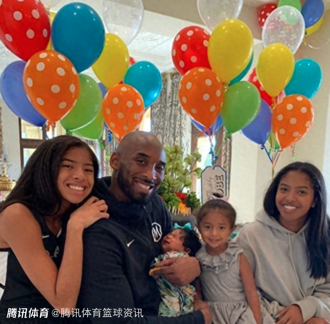 照片中,瓦妮莎当时仍然处于怀孕期,四女儿卡普里还没有出生,五人(科比、瓦妮莎和科比三个女儿)在一个充满粉色、金色和白色气球的背景板面前合影留念。