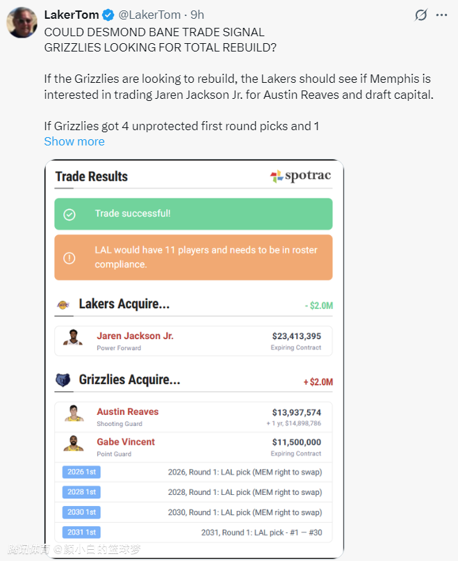 湖媒模拟了一套方案,湖人送出奥斯汀-里夫斯、盖布-文森特、湖人2026年首轮互换权、2028年首轮互换权、2030年首轮互换权、2031年首轮签,也就是6换1,这些3个首轮互换权与1个首轮签都没有保护。