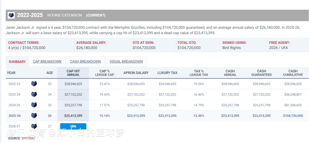小贾伦四年1.04亿的合同还剩一年,下赛季薪水仅仅为2341万,灰熊这个时候送走他也可以节省提前续约他的金额。小贾伦本赛季场均29.8分钟,拿到22.2分5.6篮板2助攻1.24抢断1.53盖帽,命中率48.8%,三分命中率37.5%,他是DPOY级的球员。