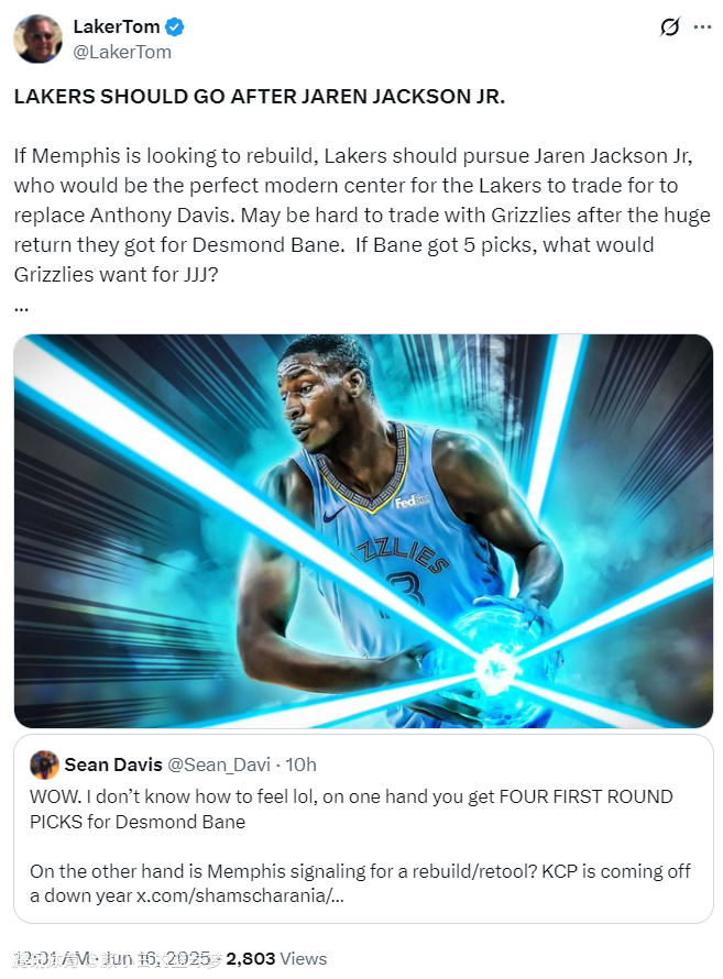 湖媒Laker Tom立马发声:湖人的确应该追求小贾伦。如果孟菲斯想要重建,湖人引进小贾伦就是取代安东尼-戴维斯最好的方案,只是贝恩都换4个首轮签+1个首轮互换,灰熊想从小贾伦这里得到些什么呢?