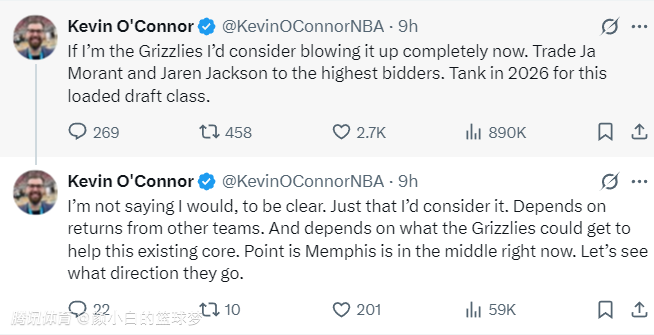 在灰熊送走贝恩后NBA记者凯文-奥康纳发声:如果是灰熊现在就考虑直接推倒重建,把莫兰特、小贾伦杰克逊都送走换回最大的回报。