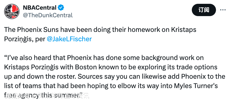 Jake Fischer表示:“我还听闻太阳已对波尔津吉斯进行了背景调查,而波士顿凯尔特人正被曝在全阵容范围内探索交易可能。消息源称,太阳同样可被列入今年夏天觊觎迈尔斯-特纳的球队名单,他们一直试图在竞争中占得先机。”